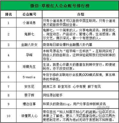 再小的个体,也有自己的品牌,微信公众平台也每个人都有了建造自己品牌的机会。微信公众平台也活跃着一批草根红人,速途研究院对草根红人及其简介进行了整理,他们是小道消息丶鬼脚七丶金融八卦女丶孕峰丶琢磨先生丶5-media丶安东尼丶蔡子辉丶槽边往事丶读懂男人心。